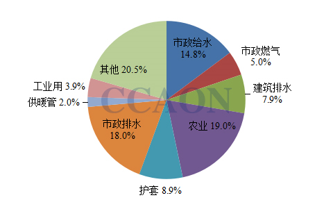 塑料管道在城市供水、排水領域的應用仍持續(xù)增長。飲水安全提升工程、灌排工程等應用為主的農(nóng)業(yè)管道工程建設也采用了大量的塑料管道,各種建筑用塑料管道增幅基本持平。在PVC管道相關產(chǎn)品中,實壁硬聚氯乙烯(PVC-U)管材最大口徑已達到1600mm;高韌性PVC-M管材和中、小口徑PVC-O管道已在一些壓力管道工程中得到成功應用;PVC-C管道加強了在消防管網(wǎng)工程的應用。